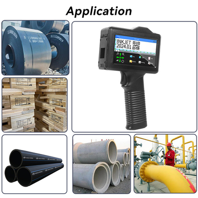 The handheld inkjet printer is designed for printing QR codes, barcodes, production dates, time stamps, logos, and batch numbers on various surfaces including glass, bags, cartons, boxes, wood, cloth, plastic, and cables.
